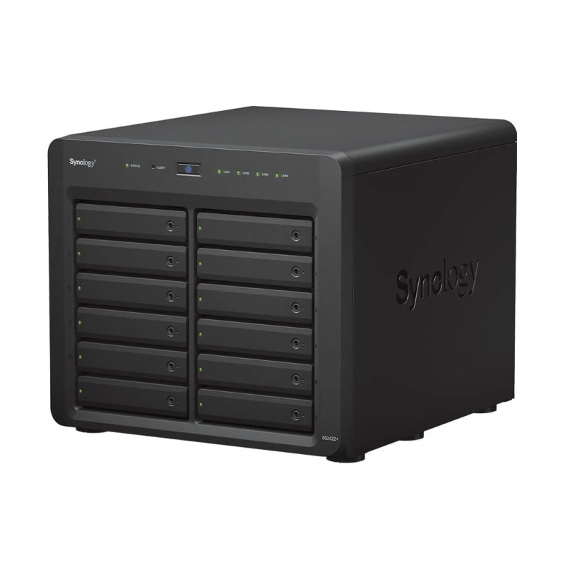 The 12-bay Synology DiskStation DS2422+ is a capable choice for small and medium businesses with large storage, file sharing, and data protection requirements in a multi-user environment. It comes with powerful storage management, file syncing, surveillance, and backup software, and is suitable for editing high-quality video and as VM storage.