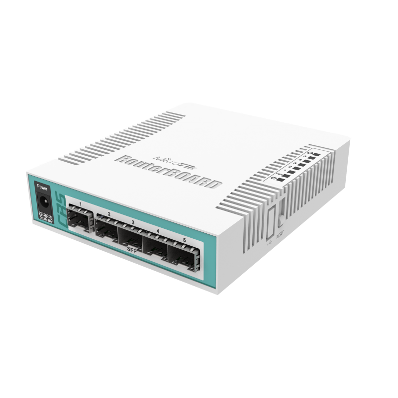 Smart Switch, 5x SFP cages, 1x Combo port (SFP or Gigabit Ethernet), 400MHz CPU, 128MB RAM, desktop case, RouterOS L5.